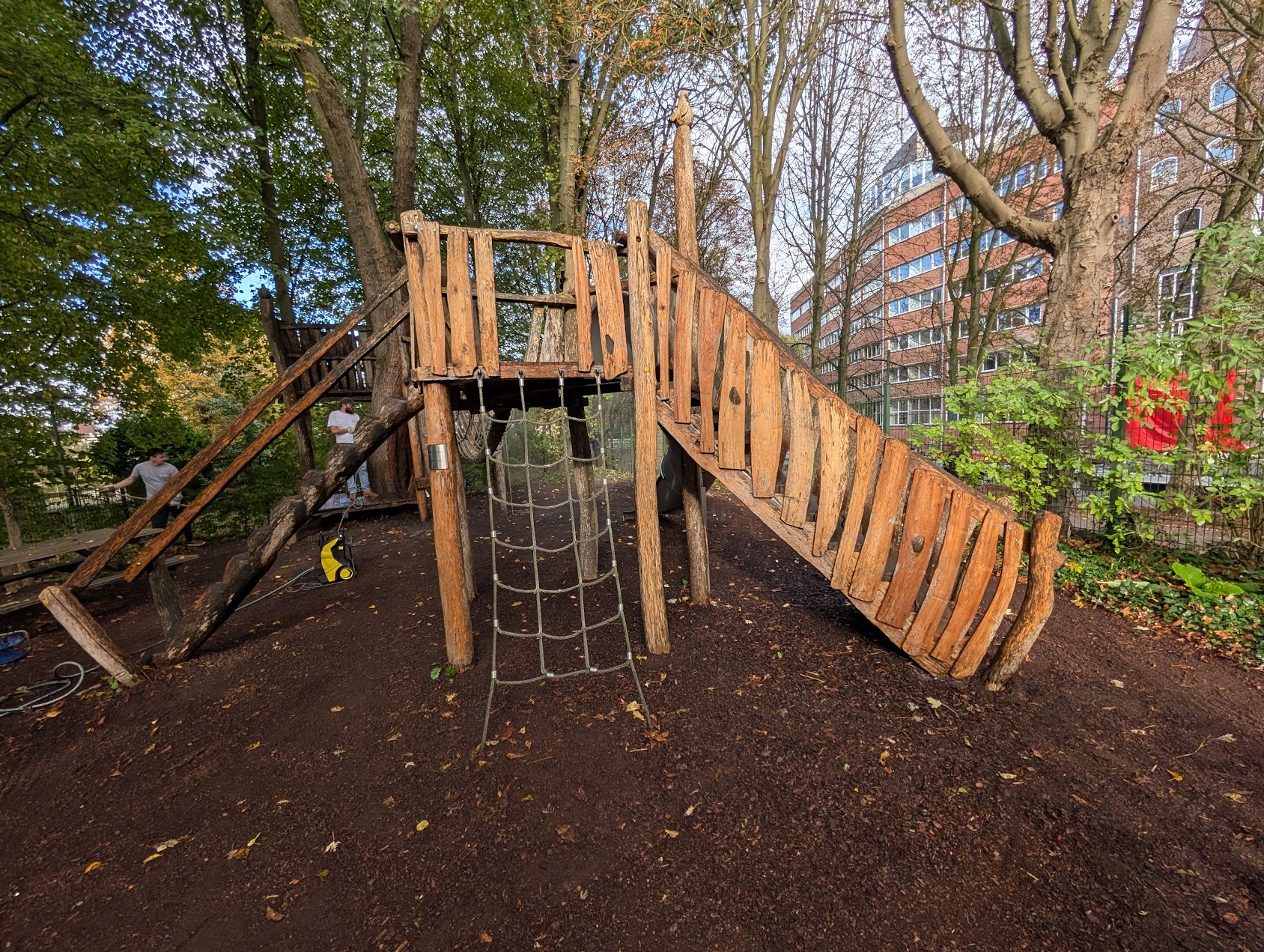 Zo is er veel geharkt en is een dik pak bladeren verwijderd rond de grote schommel en het speelfort. De bomen rondom hebben een knipbeurt gehad. De hoek oogt een stuk aantrekkelijker om in te spelen!