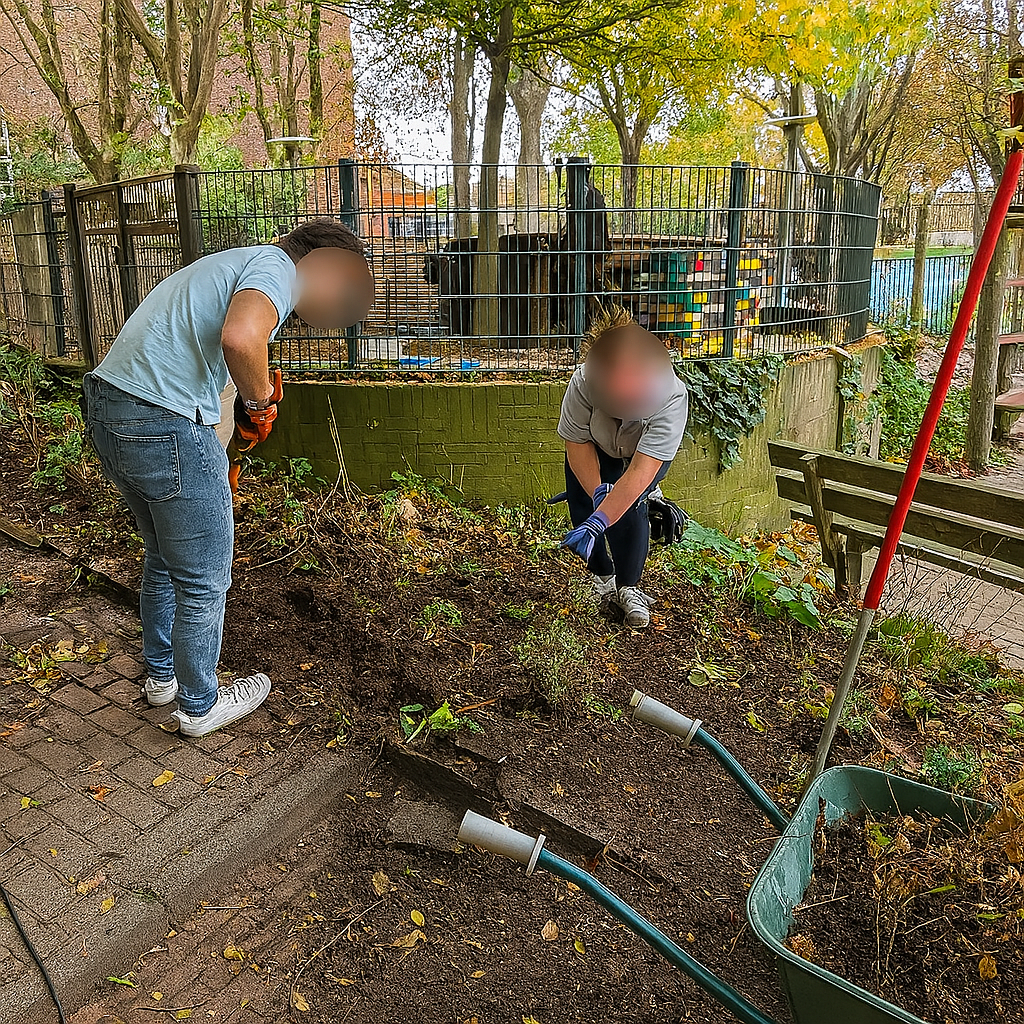 Vandaag kregen hulp van wel 18 paar handen! Medewerkers van verzekeraar A.S.R. staken hun armen uit de mouwen om onze tuin goed onder handen te nemen. En hoe! Iedereen heeft hard gewerkt en de tuin is zo goed als winterklaar.